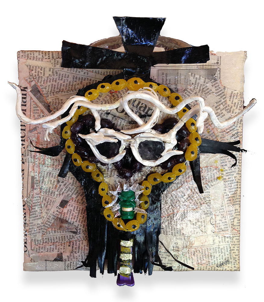 Skelton John For the skeleton exhibit in Walnut Creek. The background is obituaries. The mouth is a "Pez" dispenser.ohn
