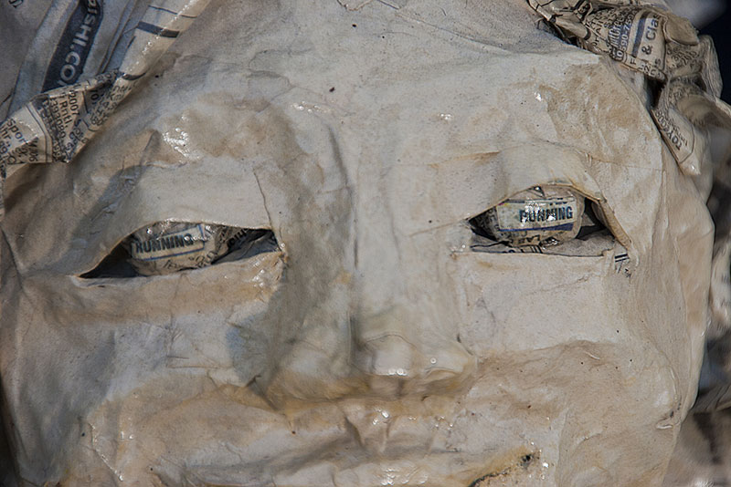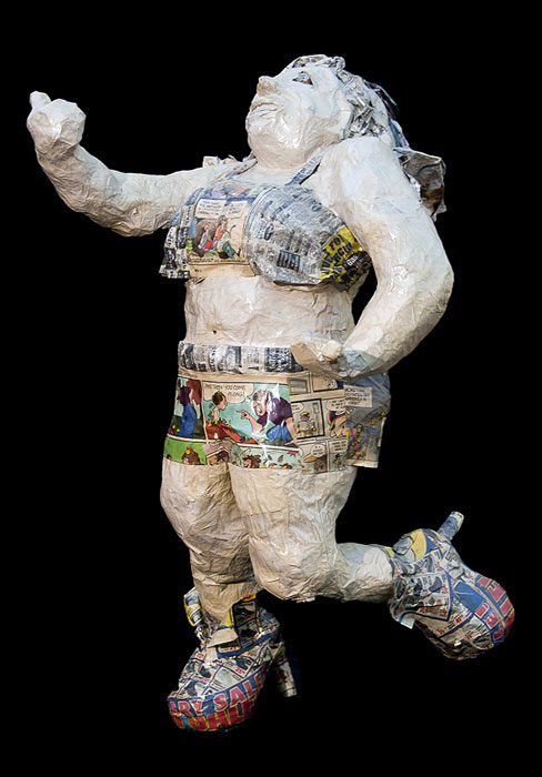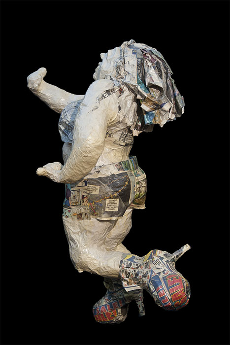 . Her hair flows with the hint of movement. She's so happy to be running in her high heeled sneakers made of shoe ads. My favorite part? Her eyeballs have newsprint that says, "running".