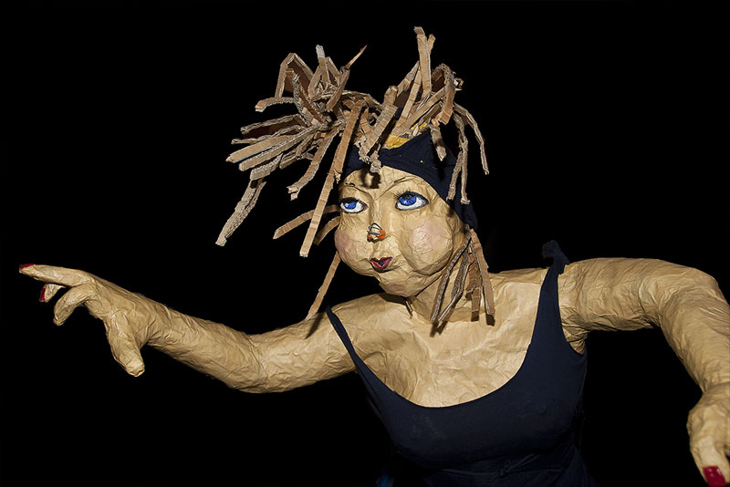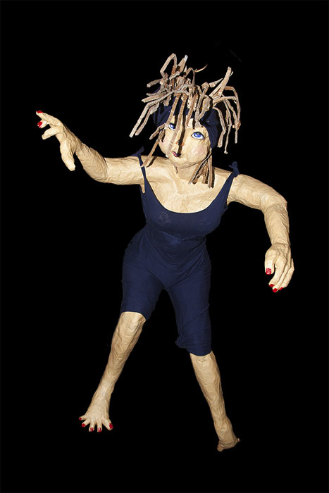 height 4' x 40" w x 40" d Was asked to participate in a mobile exhibit. Mini is a swimmer. Her 20's bathing costume has been caught on a fishing line. She's upset. You can tell by the from of her fingers on her left hand. What I love about Mini is her nose clip. Remember those?